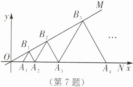 7. (2025·宁波江北区青藤书院月考)如图,在平面直角坐标系中,O 为坐标原点,点 N 在 x 轴正半轴上,点$ A_1,A_2,A_3,…,$在射线 ON 上,点$ B_1,B_2,B_3,…$在射线 OM 上$,∠MON= 30°,△A_1B_1A_2,△A_2B_2A_3,△A_3B_3A_4,…,$均为等边三角形,以此类推,若$ OA_1= 1,$则$ B_2₀_2_4 $的横坐标为______