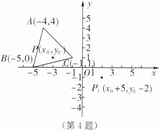 由点P(x₀,y₀)平移到点P₁(x₀+5,y₀-2),得点A(-4,4)平移到点A₁(1,2),点B(-5,0)平移到点B₁(0,-2),点C(-1,1)平移到点C₁(4,-1)。在平面直角坐标系中描出A₁,B₁,C₁三点,顺次连结这三个点,即可得到△A₁B₁C₁,如图所示。