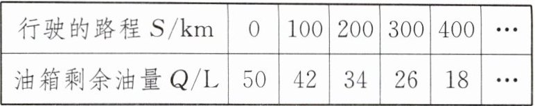 (2)变量:行驶的路程$S$和油箱中的剩余油量$Q$;常量:油箱的容量$50L$和每行驶$100km$油量减少的$8L$(或每行驶$1km$油量减少的$0.08L$)。