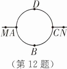 12.(2023·河北中考)如图一种轨道示意图,其中$\overset{\frown}{ADC}和\overset{\frown}{ABC}$均为半圆,点M,A,C,N依次在同一直线上,且$AM= CN$,现有两个机器人(看成点)分别从M,N两点同时出发,沿着轨道以大小相同速度匀速移动,其路线分别为$M→A→D→C→N$ 和$N→C→B→A→M$.若移动时间为x,两个机器人之间距离为y,则y x关系图象大致(