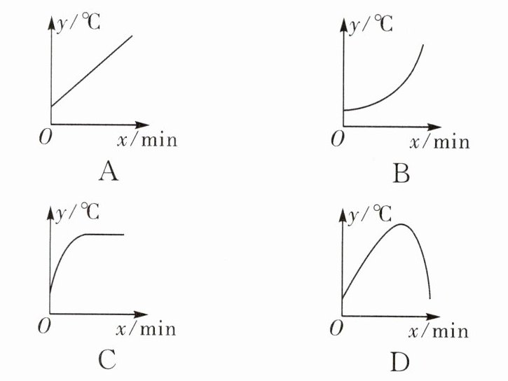 4. (2024·江西中考)将常温中的温度计插入一杯 60℃的热水(恒温)中,温度计的读数 y(℃)与时间 x(min)的关系用图象可近似表示为(