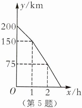 D [解析]根据图象与y轴交点坐标可得小星家离黄果树景点的路程为200km,所以选项A不正确;(200-150)÷1=50(km/h),小星从家出发第1h的平均速度为50km/h,所以选项B不正确;由图象可得,小星从家出发2h离景点的路程为75km,所以选项C不正确;(150-75)÷(2-1)=75(km/h),150÷75+1=3(h),所以选项D正确. 故选 D.