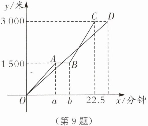 9. (2025·安徽池州期中改编)小张和妈妈同时从家沿同一直道骑自行车去公园.妈妈先以 150 米/分钟的速度骑行一段时间后,休息了 5 分钟,再以 m 米/分钟的速度到达公园,小张始终以同一速度骑行,两人离家的距离 y(米)与时间 x(分钟)的关系如图所示,请结合图象,回答: