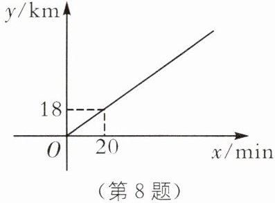 8. 甲车从 A 地出发匀速行驶,它行驶的路程 y(单位:km)与行驶的时间 x(单位:min)之间的函数关系如图所示.甲车出发 20 min 后,乙车从 A 地出发沿同一路线匀速行驶.若乙车经过 20 min~30 min 追上甲车,则乙车的速度 v(单位:km/min)的取值范围是______