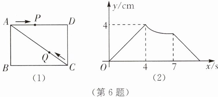 C [解析]根据题意,结合函数图象,可知,当0≤x<4时,点P在AD上运动;当x=4时,点P运动到点D,即AD=2×4=8(cm);当4<x<7时,点P在DC上运动;当x=7时,点P运动到点C,即CD=2×7-8=6(cm). 在长方形ABCD中,AD=8cm,CD=6cm,则AC=10cm. 故选 C.