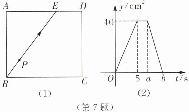 ∴AB=DC,BC=AD. A. 当t=5时,点P运动到点E,此时S△BPC=$\frac{1}{2}$BC·AB=$\frac{1}{2}$×8×BC=40,解得BC=10,则A正确,故本选项不符合题意;B. 由AD=BC=10,AE=6,得ED=AD-AE=4,结合点P的运动速度为2cm/s,得tED=$\frac{ED}{2}$=2s,那么a=5+2=7,则B正确,故本选项不符合题意;C. 由DC=AB=8,点P的运动速度为2cm/s,得tDC=$\frac{DC}{2}$=4,则b=7+4=11,C错误,故本选项符合题意;D. 当t=8s时,y=$\frac{1}{2}$BC·[DC-(8-7)×2]=$\frac{1}{2}$×10×6=30(cm²),则D正确,故本选项不符合题意. 故选 C.