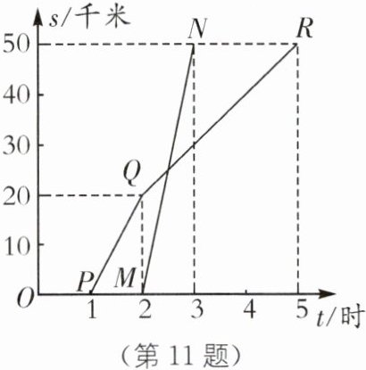 11. 如图,A,B 两地相距 50 千米,甲于某日下午 1 时骑自行车从 A 地出发驶往 B 地,乙也于同日下午骑摩托车按路线从 A 地出发驶往 B 地,图中的折线 PQR 和线段 MN 分别表示甲、乙所行驶的路程 s 和时间 t 的关系.