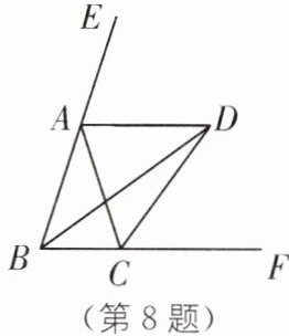 8. 如图,∠ABC= ∠ACB,AD,BD,CD 分别平分△ABC 的外角∠EAC,内角∠ABC,外角∠ACF,以下结论:①AD//BC;②∠ACB= 2∠ADB;③∠ADC= 90°-∠ABC;④∠BDC= 1/2∠BAC.其中正确的结论有______