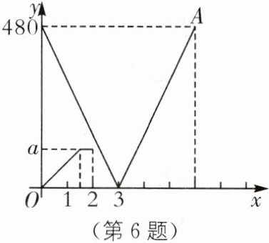 6. (2024·宁波鄞州期末)已知甲、乙两地相距 480 km,一辆轿车从甲地出发前往乙地,到达乙地后立即按原路原速返回甲地.一辆货车与轿车同时出发,以 80 km/h 的速度沿同一条公路从乙地前往甲地,途经服务区时货车停车装货耗时 30 分钟,待装货完毕,货车立即调整车速继续匀速前往甲地,最后与轿车同时到达甲地,如图是两车离乙地的距离 $ y(\text{km}) $ 与货车行驶时间 $ x(\text{h}) $ 之间的函数图象,结合图象回答下列问题: