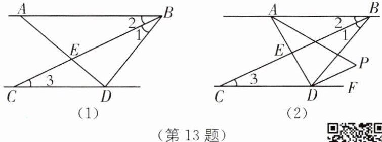 13. 如图,AB//CD,BC 平分∠ABD 交 AD 于点 E,∠1= ∠3.