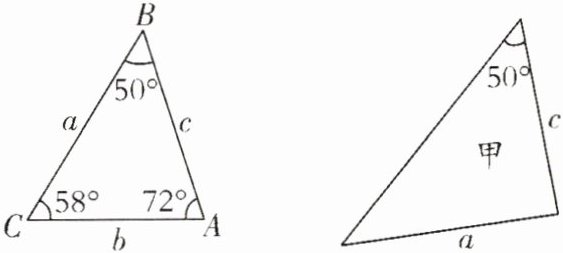 甲三角形:已知两边a、c和其中一边的对角50°,即SSA,无法判定与△ABC全等。