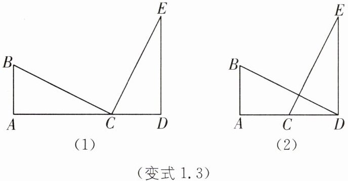 变式 1.3 (1)如图(1),AB⊥AD,ED⊥AD,AB= CD,AC= DE,试说明 BC⊥CE 的理由;(2)如图(2),若△ABC 向右平移,使得点 C 移到点 D 的位置,AB⊥AD,ED⊥AD,AB= CD,AD= DE,探索 BD⊥CE 的结论是否成立,并说明理由.