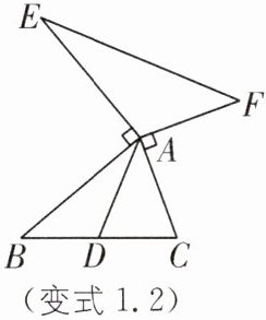 变式 1.2 如图,AD 是△ABC 的中线,AB= AE,AC= AF,∠BAE= ∠CAF= 90°,判断线段 EF和 AD 的数量关系和位置关系,并加以证明.