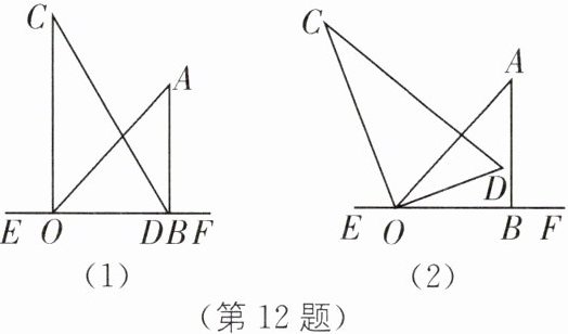 12. 分类讨论思想 将一副三角板按照如图(1)所示的位置放置在直线 EF 上,现将含 30°角的三角板 OCD 绕点 O 逆时针旋转 180°,在旋转过程中,完成以下问题.