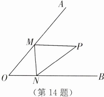 14. (2024·绥化中考)如图,已知∠AOB= 50°,点 P 为∠AOB 内部一点,点 M 为射线 OA、点 N 为射线 OB 上的两个动点,当△PMN 的周长最小时,则∠MPN= .