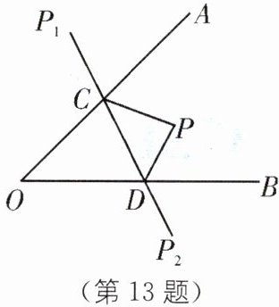 13. 如图,点 P 是∠AOB 内任意一点,以 OA,OB 为对称轴分别画出点 P 经轴对称变换后的点$ P_1,P_2,$连结$ P_1P_2,$分别与 OA,OB 相交于点 C,D. 已知$ P_1P_2= 8 cm,$求△PCD 的周长.
