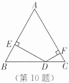 10. (2025·江西南昌东湖区期末)如图,在△ABC中,AB= AC,点D是BC上任意一点,DE⊥AB,DF⊥AC,若$AB= 10 cm,S△ABC= 25 cm^2,$则DE+DF的长为______cm.