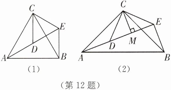 ;(2)[拓展探究]如图(2),△ACB 和△DCE 均为等腰直角三角形,∠ACB= ∠DCE= 90°,点 A,D,E 在同一直线上,CM 为△DCE 中 DE 边上的高,连结 BE. 请判断∠AEB 的度数及线段 CM,AE,BE 之间的数量关系,并说明理由.