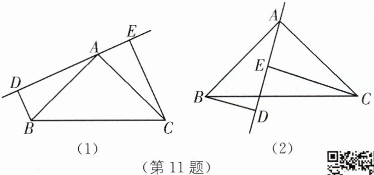 11. 如图,在△ABC中,AB= AC,DE是过点A的直线,BD⊥DE于点D,CE⊥DE于点E.