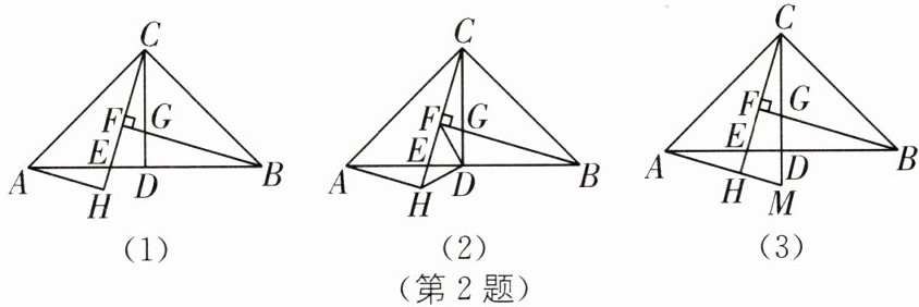 2. 已知∠ACB= 90°,AC= BC,D 为 AB 的中点,E 为 AB 边上的一点.作 BF⊥CE 于点 F,交 CD 于点 G,过点 A 作 AH⊥CE 于点 H.