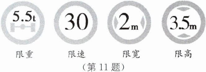 11. 新情境 交通标志 在公路上,同学们常能看到如图几种不同的交通标志图形,它们有着不同的意义,如果设汽车载重为 x,速度为 y,宽度为 l,高度为 h,请你用不等式表示图中各种标志的意义.