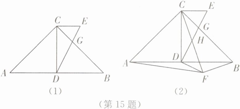 15. 母子型 如图(1),在△ABC 中,AC= BC,CD 为 AB 边上的中线,CE//AB,线段 DE 交 BC 于点 G.