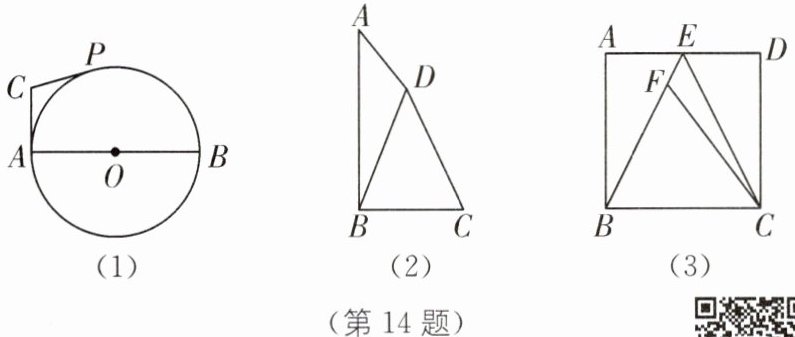 14. 母子型 (1)[问题提出]如图(1),AB 为$\odot O$的直径,$AC \perp AB$,$AB= 16$,$AC= 6$,P 为$\odot O$上的一动点,连结 CP,求 CP 的最小值.