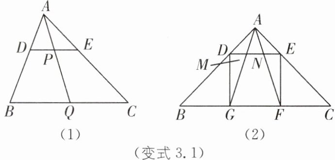变式 3.1 (1)如图(1)所示,在△ABC中,点D,E,Q分别在AB,AC,BC上,且DE//BC,AQ交DE于点P,求证:$\frac{DP}{QB}= \frac{PE}{QC}$;