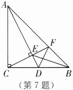 7. (2025·江苏无锡滨湖区期中)如图,在 Rt△ABC 中,$\angle ACB= 90^\circ$,$AC= BC= 1$,点 D 为 BC 的中点,连结 AD,过点 C 作 CE⊥AD,垂足为 E,线段 CE 的延长线交 AB 于点 F,连结 BE,DF.如下结论:①$DB^2= DE\cdot DA$;②EB 平分∠DEF;③$BF= \frac{\sqrt{2}}{3}$;④$S_{\triangle BDF}:S_{\triangle AEF}= 2:3$.其中正确结论为( ).
