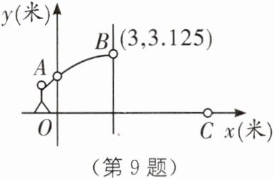9. (2025·上海黄浦区一模)如图,体育课上投掷实心球活动.小明某次投掷实心球,实心球出手后的运动过程中距离地面的高度 y(米)关于水平距离 x(米)的函数表达式为 $ y= -\frac{1}{8}x^{2}+bx+c $,当实心球运动到点 B 时达到最高点,那么实心球的落地点 C 与出手点 A 的水平距离 OC 为______米.