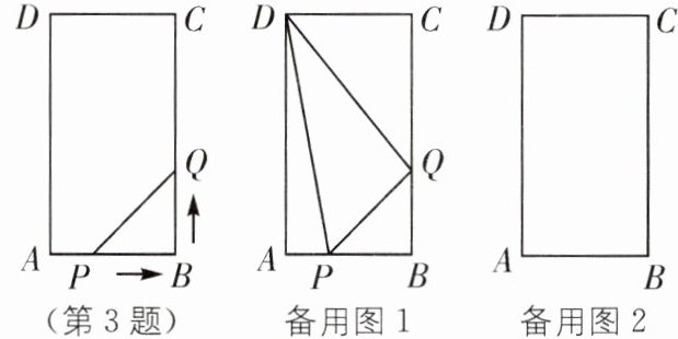 3. 如图,在矩形ABCD中,$AB= 6\ \text{cm}$,$BC= 12\ \text{cm}$,点P从点A出发,沿AB边向点B以1 cm/s的速度移动,同时,点Q从点B出发沿BC边向点C以2 cm/s的速度移动. 如果P,Q两点在分别到达B,C两点后就停止移动,回答下列问题: