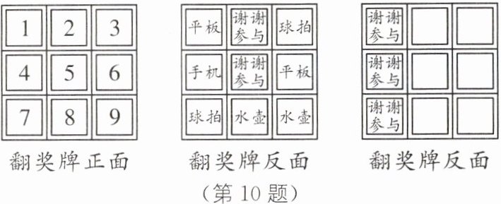 10. (2024·江苏泰州泰兴期末)某商家举行有奖销售活动,抽奖活动设置如图的翻奖牌,翻奖牌的正面、背面如图,若只能在 9 个数字中选择一个数字翻牌,请解决下面的问题:
