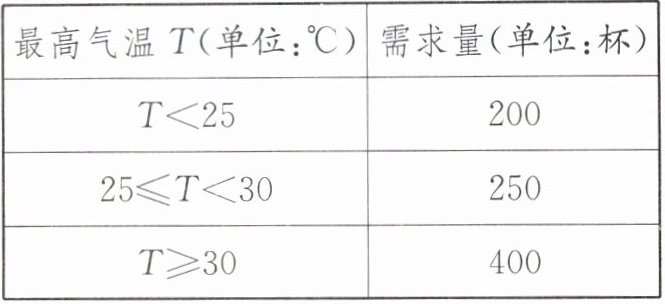 (3)若今年六月份每天的进货量均为350杯,每杯的进价为4元,售价为8元,未售出的这种鲜奶,厂家以1元的价格收回销毁.假设今年与去年的情况大致一样,若今年六月份某天的最高气温T满足25≤T<30(单位:℃),试估计这一天销售这种鲜奶所获得的利润为多少元.