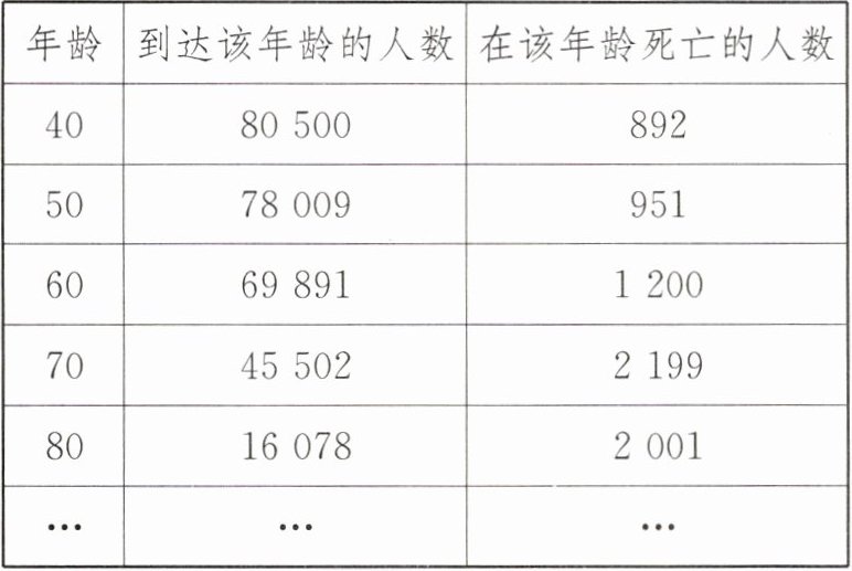 |年龄|到达该年龄的人数|在该年龄死亡的人数|