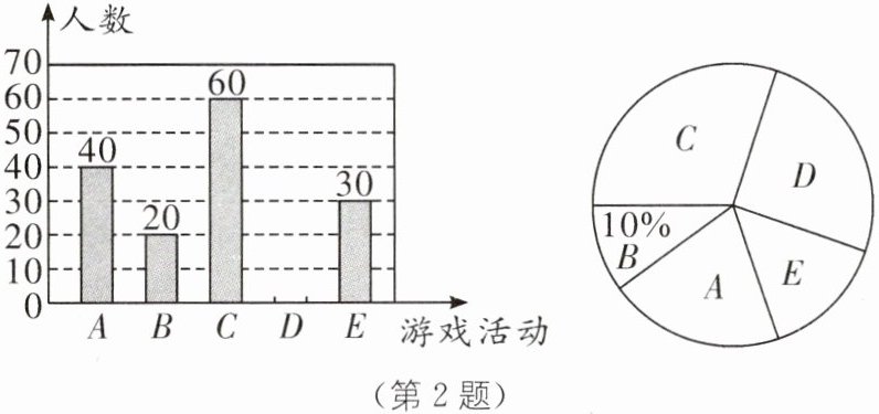 2. 3月14日是国际数学日,某校在“国际数学日”当天举行了丰富多彩的数学活动,其中游戏类活动有:A. 数字猜谜;B. 数独;C. 魔方;D. 24点游戏;E. 数字华容道.该校为了解学生对这五类数学游戏的喜爱情况,随机抽取部分学生进行了调查统计(每位学生必选且只能选一类),并根据调查结果,绘制了两幅不完整的统计图如图所示.