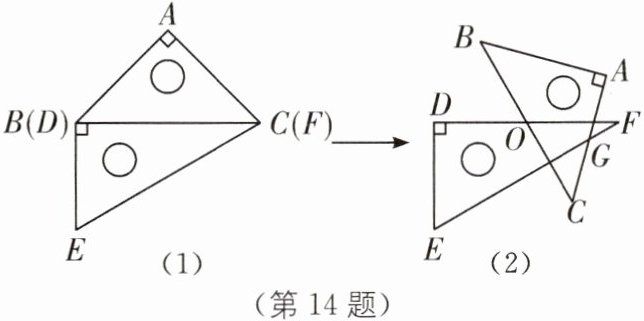 14. (2025·河北沧州期末)一副三角板按图(1)放置,O 是边 BC(DF)的中点,$BC= 12cm$,如图(2),将$\triangle ABC$绕点 O 顺时针旋转$60^{\circ }$,AC 与 EF 相交于点 G,则 FG 的长是______cm.
