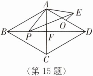 15. 如图,菱形 ABCD 中对角线 AC 与 BD 相交于点 F,且$AC= 8,BD= 8\sqrt {3}$,若点 P 是对角线 BD 上一动点,连结 AP,将 AP 绕点 A 逆时针旋转至 AE,使得$\angle PAE= \angle BAD$,连结 PE,取 AD 的中点 O,连结 OE,则在点 P 的运动过程中,求线段 OE 的最小值.