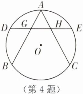 4. 如图所示,$D$,$E$ 分别是 $\overset{\frown}{AB}$,$\overset{\frown}{AC}$ 的中点,$DE$ 交 $AB$ 于点 $G$,交 $AC$ 于点 $H$. 求证:$AG= AH$.