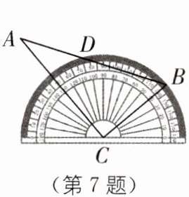 7. 如图,将一把三角尺放置在量角器上,使点$C$与圆心重合,若$\angle ACB= 90^\circ$,$\angle A= 30^\circ$,三角尺的直角边$BC$和量角器所在圆的半径相等,点$D是斜边AB$与量角器的交点,若点$B的对应刻度为139^\circ$,则点$D$的对应刻度为( ).