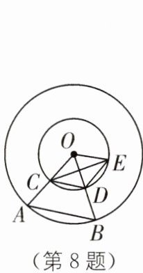 8.(2025·安徽合肥瑶海区期末)已知:如图,在两个同心圆中,大圆半径 OA 是小圆半径 OC 的 2 倍,点D,E,B 均在圆上,若$∠AOB= ∠COD= $$∠DOE$,连结 AB,DE 和 CE,则下列说法不正确的是(