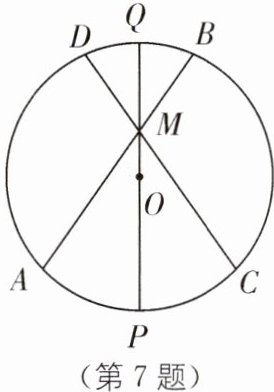 7. 如图,$\odot O$的两弦 AB,CD 相交于点 M,直径PQ 过点 M,且 MP 平分$∠AMC$,则图中相等的线段有(