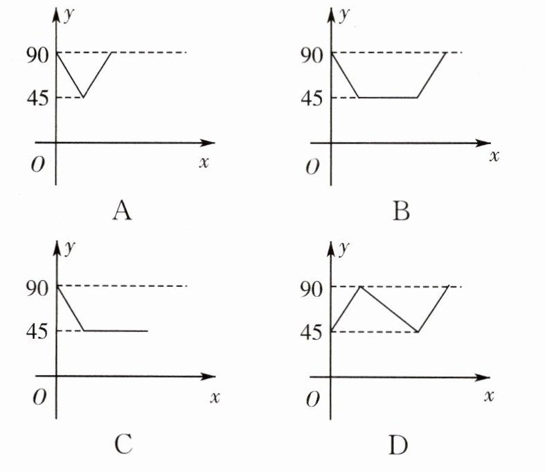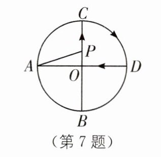 7. 如图,AD,BC 是$\odot O$的两条互相垂直的直径,点 P 从点 O 出发,沿$O→C→D→O$的路线匀速运动,设$\angle APB= y$(单位:度),那么 y 与点 P 运动的时间 x(单位:秒)的关系图是(