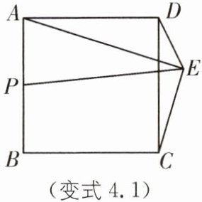 变式4.1 如图,正方形ABCD的边长为4,点E是正方形外一动点,且点E在CD的右侧,$\angle AED= 45^\circ$,P为AB的中点,当E运动时,求线段PE的最大值.