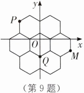 9.(2024·上海闵行区三模)蜂巢结构精巧,其巢房横截面的形状均为正六边形.如图是部分巢房的横截面图,图中7个全等的正六边形不重叠且无缝隙,将其放在平面直角坐标系中,点 P,Q,M 均为正六边形的顶点.若点 P,Q 的坐标分别为$(-2\sqrt {3},3),(0,-3)$,则点 M 的坐标为 _ .