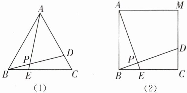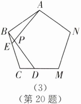 20. 转化思想 中考新考法 类比猜想 如图(1)(2)(3),点 E,D 分别是正三角形 ABC,正方形 ABCM,正五边形 ABCMN 中以点 C 为顶点的相邻两边上的点,且$BE= CD$,DB 交 AE 于点 P.