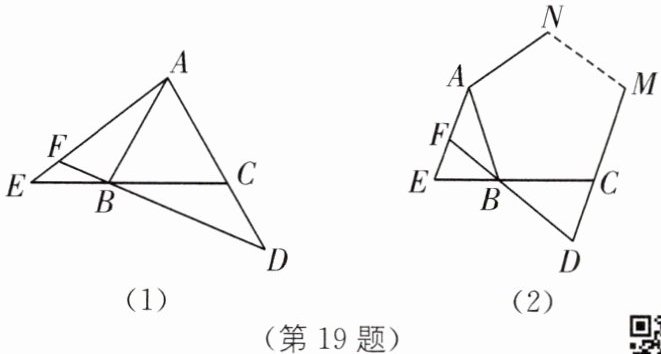 19. (1)如图(1)所示,$△ABC$是正三角形,E,D 分别是 CB 和 AC 延长线上的点,且$BE= CD$,连结 DB 并延长,交 AE 于点 F,求$∠AFB$的度数;