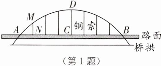 1. 如图是某钢结构拱桥示意图,桥拱$\overset{\frown}{ADB}$可以近似看作圆弧,桥拱$\overset{\frown}{ADB}$和路面(弦 AB)之间用7根钢索相连,钢索均垂直路面 AB. 已知7根钢索将路面 AB 八等分,$AB= 40\ \text{m}$,最中间的钢索$CD= 10\ \text{m}.$