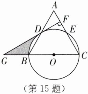 15. (2025·河北秦皇岛期中改编)如图,在$ \triangle ABC $中,$ CA= CB $,以$ BC 为直径的 \odot O 分别与 AB $,$ AC 相交于点 D $,$ E $,过点$ D 作 DF\perp AC $,垂足为$ F $. 分别延长$ CB $,$ FD 相交于点 G $,$ \angle A= 60^{\circ} $,$ \odot O $的半径为 6,求阴影部分的周长.