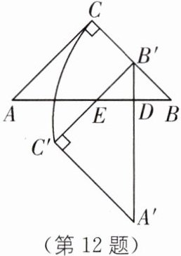 12. 如图,$ \triangle ABC $是等腰直角三角形,$ \angle ACB= 90^{\circ} $,$ AC= BC= 4 $,点$ D 是斜边 AB $上一点,且$ BD= \frac{1}{4}AB $,将$ \triangle ABC 绕点 D 逆时针旋转 90^{\circ} $,得到$ \triangle A'B'C' $,$ B'C' 交 AB 于点 E $. 其中点$ C 的运动路径为弧 CC' $,则弧$ CC' $的长度为 .