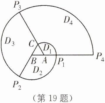 19. 如图,$ \triangle ABC $为等边三角形,边长为 1 cm. 将线段$ AC 绕点 A 顺时针旋转 120^{\circ} 至 AP_1 $,形成扇形$ D_1 $;将线段$ BP_1 绕点 B 顺时针旋转 120^{\circ} 至 BP_2 $,形成扇形$ D_2 $;将线段$ CP_2 绕点 C 顺时针旋转 120^{\circ} 至 CP_3 $,形成扇形$ D_3 $;将线段$ AP_3 绕点 A 顺时针旋转 120^{\circ} 至 AP_4 $,形成扇形$ D_4 $……设$ l_n 为扇形 D_n $的弧长($ n= 1,2,3,… $),回答下列问题: